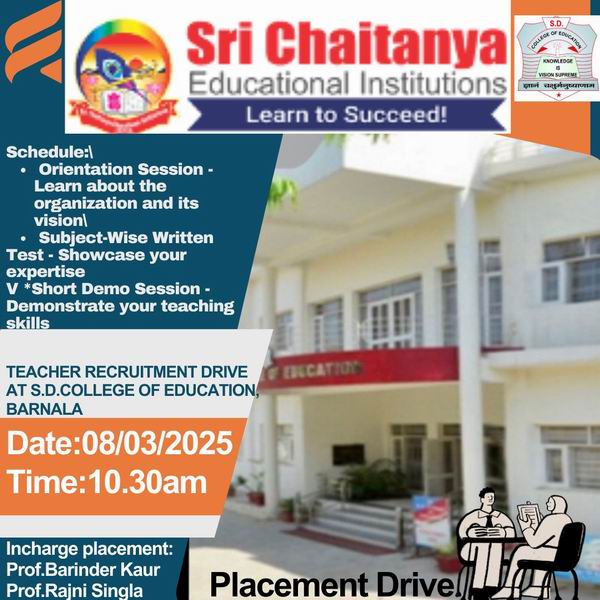 ਸ੍ਰੀ ਚੈਤਨਿਆ ਟੈਕਨੋ ਸਕੂਲ ਵਾਸਤੇ ਅਧਿਆਪਕਾਂ ਲਈ ਪਲੇਸਮੈਂਟ ਡਰਾਈਵ ਅੱਜ