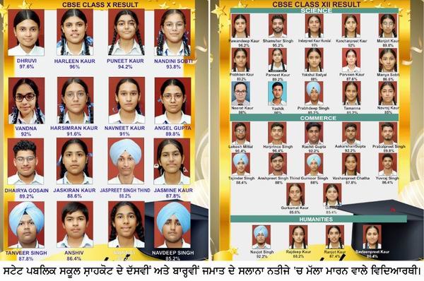 ਸਟੇਟ ਪਬਲਿਕ ਸਕੂਲ ਸ਼ਾਹਕੋਟ ਦਾ ਦੱਸਵੀਂ ਅਤੇ ਬਾਰ੍ਹਵੀਂ ਜਮਾਤ ਦਾ ਨਤੀਜਾ 100 ਫੀਸਦੀ ਰਿਹਾ।